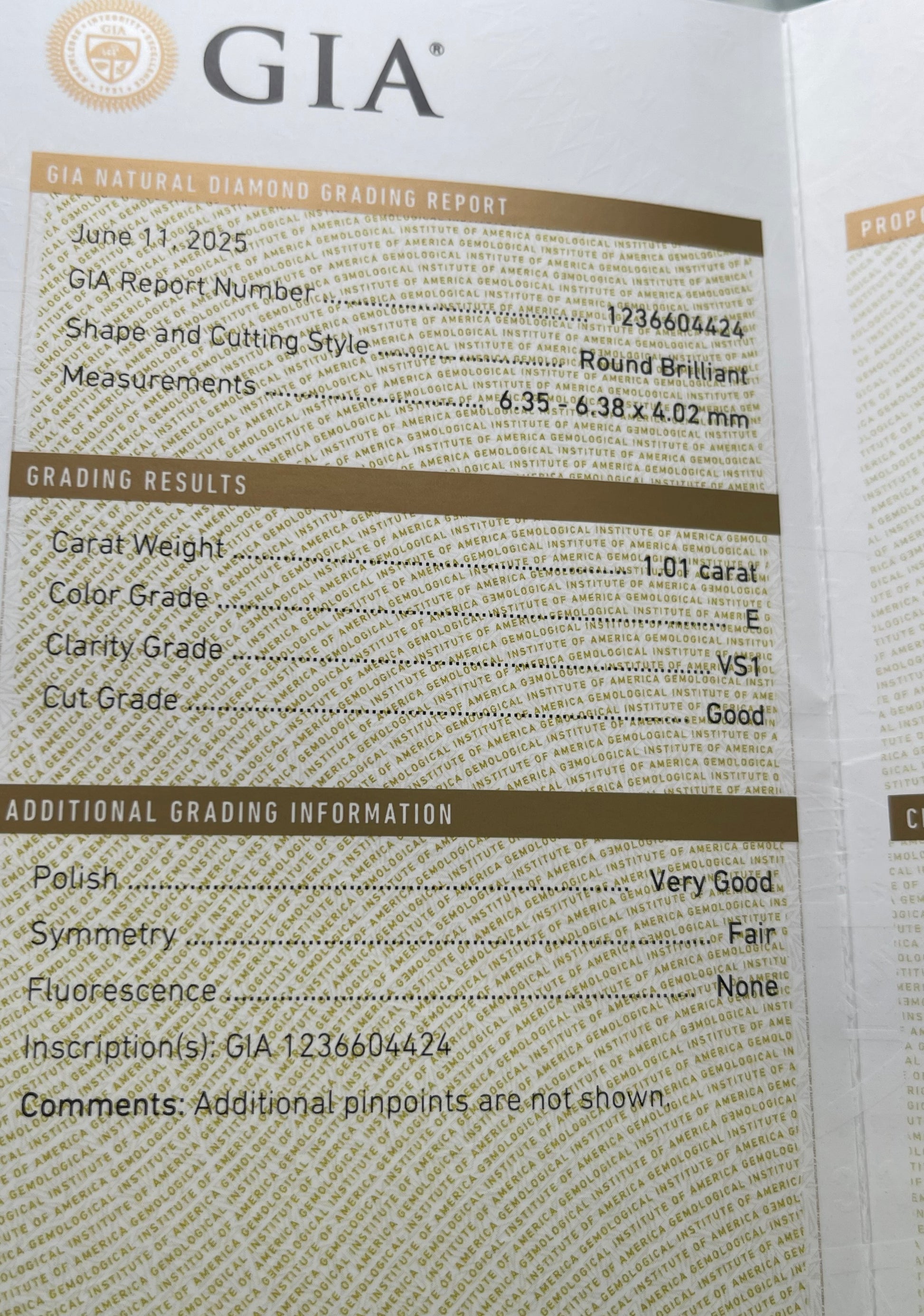 GIA 1.01 Carat Round Brilliant Diamond E VS1 Good Cut Very Good Polish